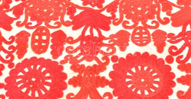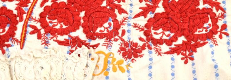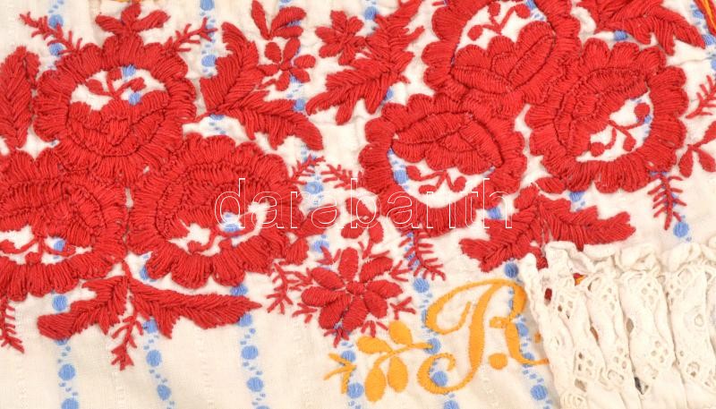 Leírás: Rátétes párnahuzat, hímzett zsákvászon, 50x35 cm + Matyó hímzés, R.J. monogrammal, 50x15 cm