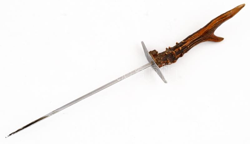 Leírás: Régi agancs végű grillnyárs, az agancson sérüléssel, h: 20,5 cm, teljes: 34 cm,