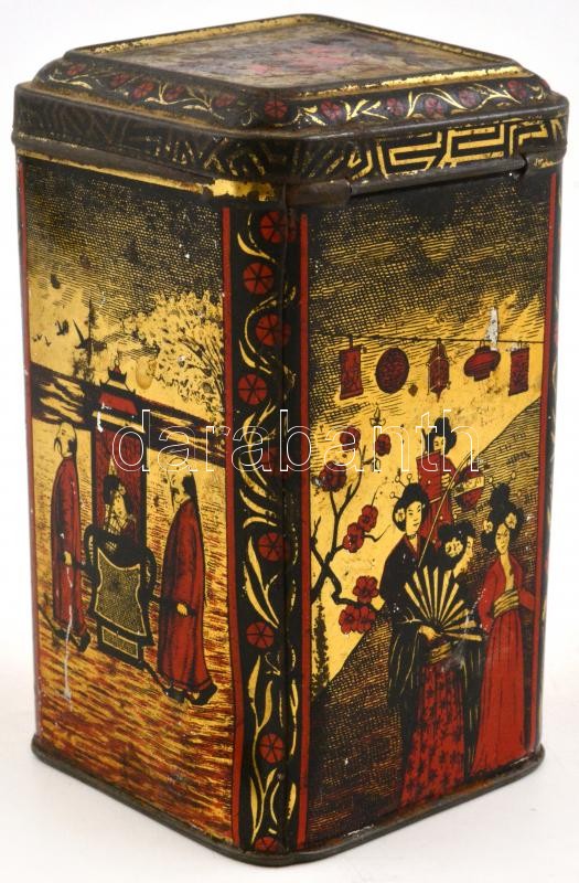 Leírás: Régi fém teásdoboz, keleti motívumokkal, horpadással, kopottas állapotban, 12×7×7 cm