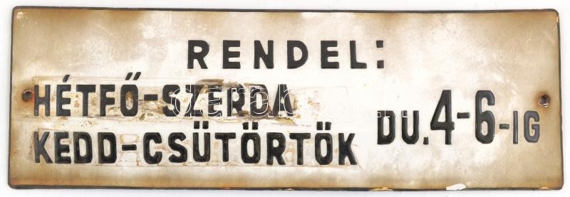 Leírás: "Rendel: Hétfő-Szerda, Kedd-Csütörtök Du. 4-6-ig", zománcozott fém tábla, 10x30 cm