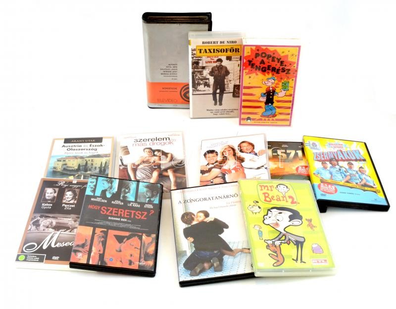 Leírás: Vegyes VHS és DVD tétel, 12 db: A zongoratanárnő, Mr. Bean 2., Szerelem és más drogok, Meseautó, Taxisofőr