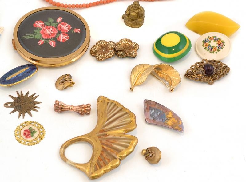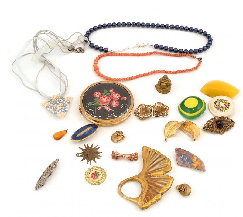 Leírás: Vegyes bizsu tétel, 20 db, medálok, kitűzők, nyakláncok, kis Buddha medál, régi púderes dobozkával. Különféle méretben. Változó állapotban.