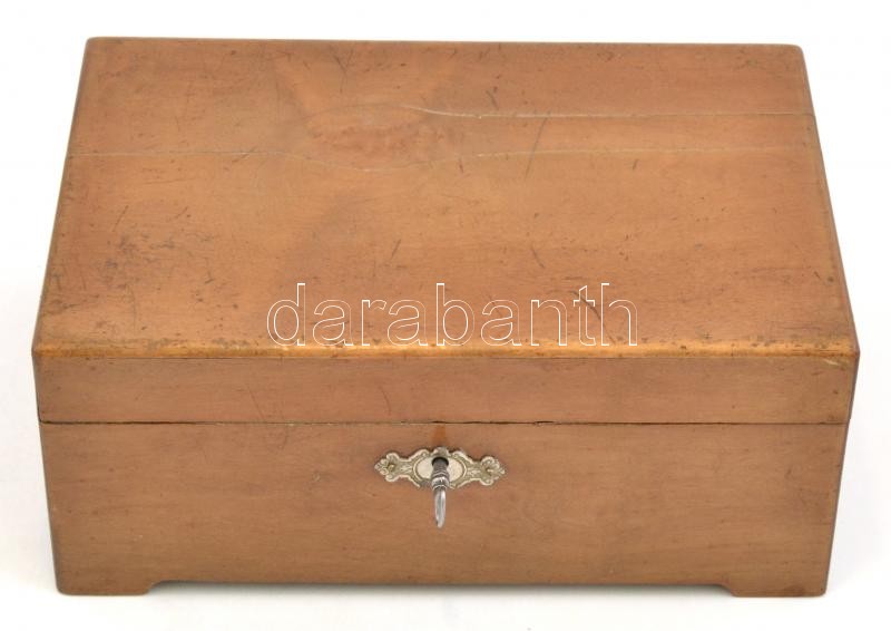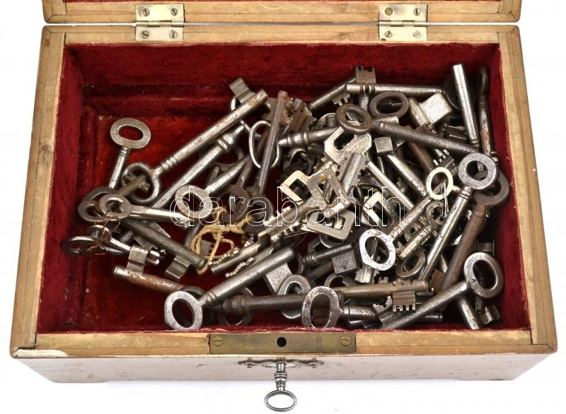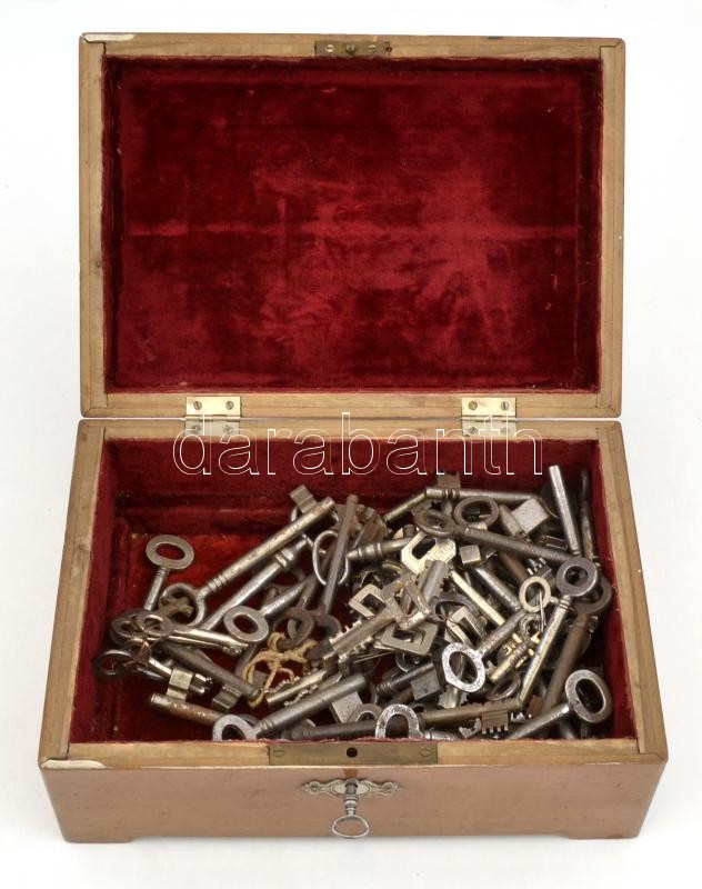 Leírás: cca 1900-1970, hatalmas fém kulcs tétel, össz. kb. 70 db, sok régi, míves darabbal. Kulcsra zárható fa ládikóban, fedele sérült, 10x17,5x25 cm