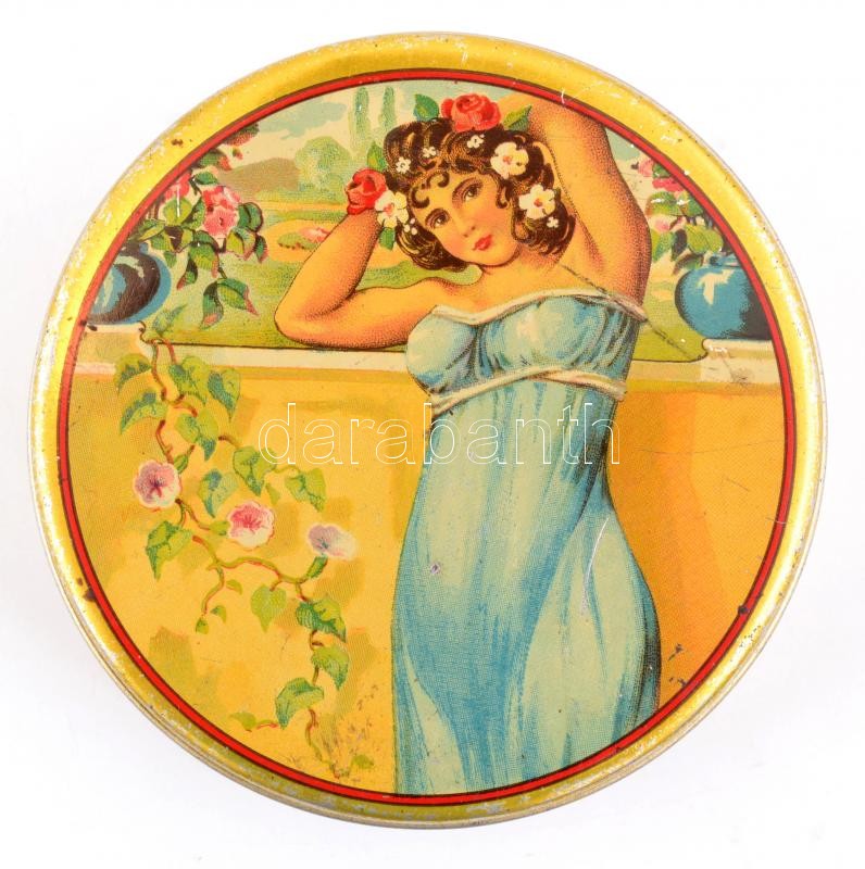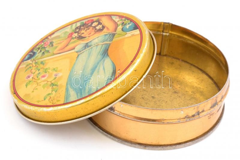Leírás: cca 1930 Első Kecskeméti Konzervgyár R.T. fém díszdoboza, a tető belső oldalán jelzett, kopottas állapotban, d: 10 cm