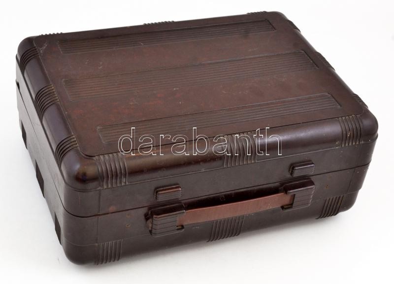 Leírás: cca 1960 retró szovjet hordozható lemezjátszó műanyag, repedt tokkal + kb. 40 db lemezjátszó tű műanyag zacskóban + lemeztisztító, 16x30x39 cm