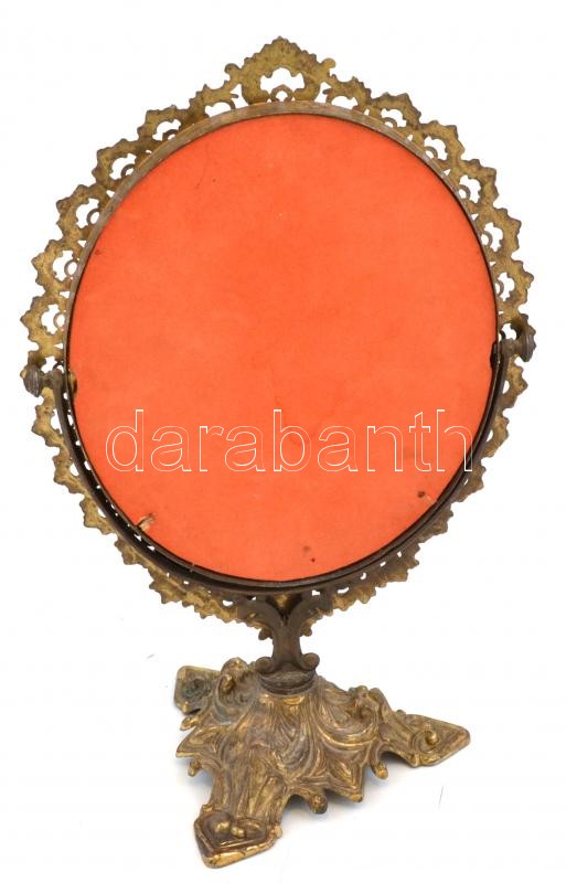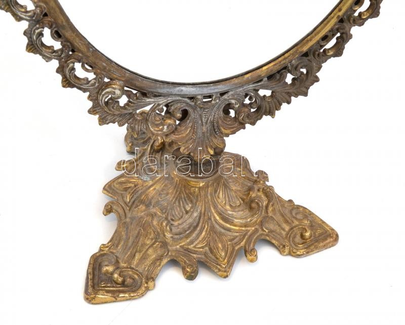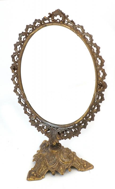 Leírás: Neobarokk stílusú réz tükör kopottas állapotban, egy helyen forrasztás nyoma látható, 49x29 cm