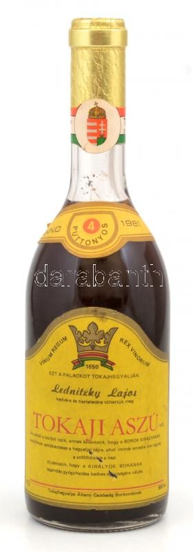 1981 4 puttonyos Tokaji Aszú, Tokajhegyaljai Állami Gazdaság, 500 ml https://www.darabanth.com/hu/373-Gyorsarveres/373.0/Mutargy-papirregiseg-egyeb/Muzealis-borok-italok~500014/1981-4-puttonyos-Tokaji-Aszu-Tokajhegyaljai-Allami-Gazdasag-500-ml~II2163815