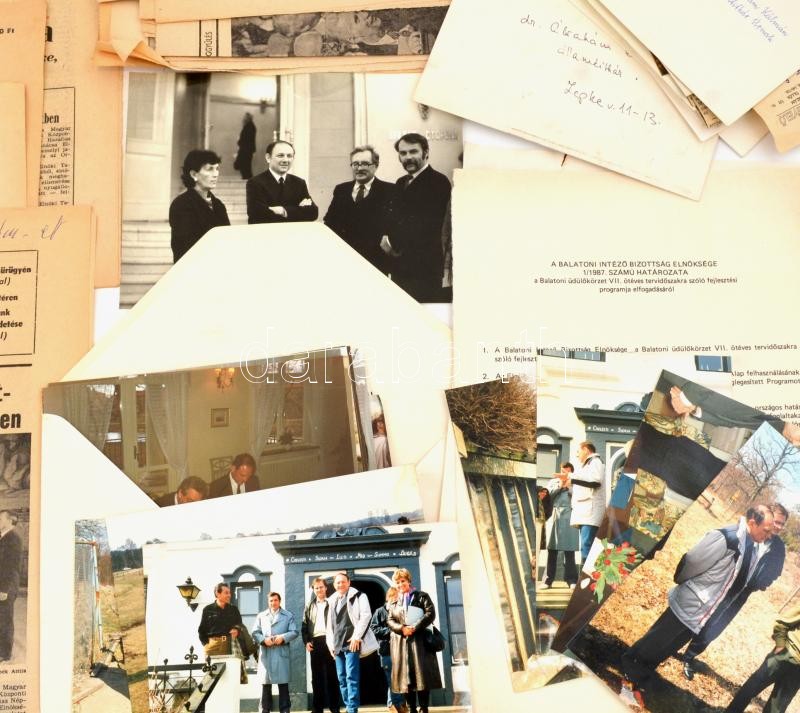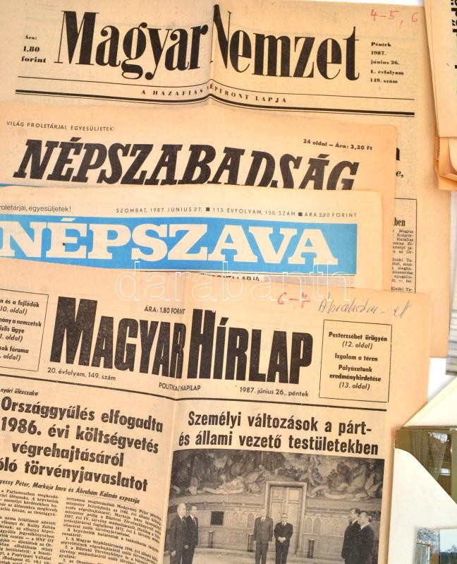 cca 1987 Vegyes újság, irat, fotó és papírrégiség tétel, feltehetően dr. Ábrahám Kálmán (1931-1997) államtitkár, miniszter hagyatékából: Napilapok részben hiányos számai 1987-ből (Népszabadásg, Magyar Hírlap, Népújság stb. + fotók egy magyar delegáció svédországi látogatásáról, dr. Ábrahám Kálmán (1931-1997) elvtárs államtitkárnak címezve, aki akkoriban Az Országos Környezet- és Természetvédelmi Hivatal elnöke volt, részben sérült, 10x15 cm + Gáspár Sándor (1917-2002), a Szakszervezetek Országos Tanácsának elnöke köszönő levele autográf aláírásával, fejléces papíron, Ábrahám Kálmánnak címezve + meghívók különböző politikai és tudományos ünnepségekre, eseményekre, konferenciákra stb.