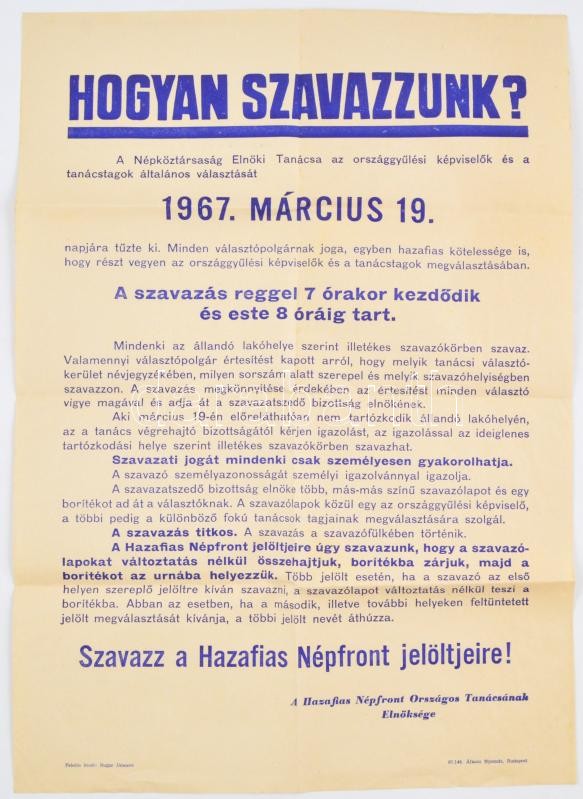1967 "Hogyan szavazzunk?" Hazafias Népfront plakátja, hajtott, kis gyű... https://www.darabanth.com/hu/373-Gyorsarveres/373.0/Mutargy-papirregiseg-egyeb/Plakat~500032/1967-Hogyan-szavazzunk-Hazafias-Nepfront-plakatja-hajtott-kis-gyurodesekkel-58x41-cm~II2181209