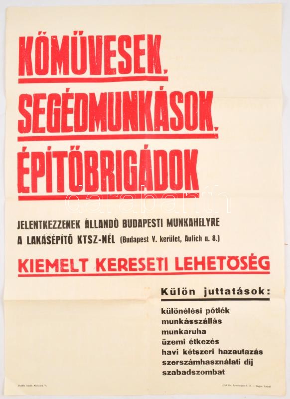 "Kőművesek, segédmunkások, építőbrigádok, kiemelt kereseti lehetőség" ... https://www.darabanth.com/hu/373-Gyorsarveres/373.0/Mutargy-papirregiseg-egyeb/Plakat~500032/Komuvesek-segedmunkasok-epitobrigadok-kiemelt-kereseti-lehetoseg-Lakasepito-KTSZ-~II2181219