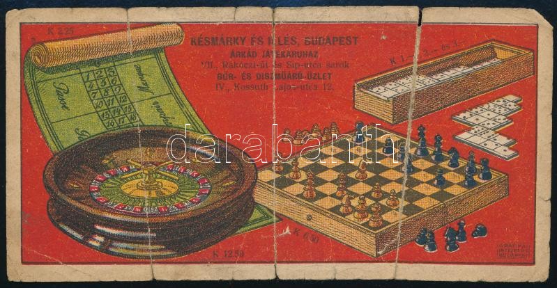Leírás: Késmárky és Illés, Árkád Játékáruház, számolócédula, Bp., Grafikai Intézet-ny., litho, hajtott, sérült, 7x14 cm