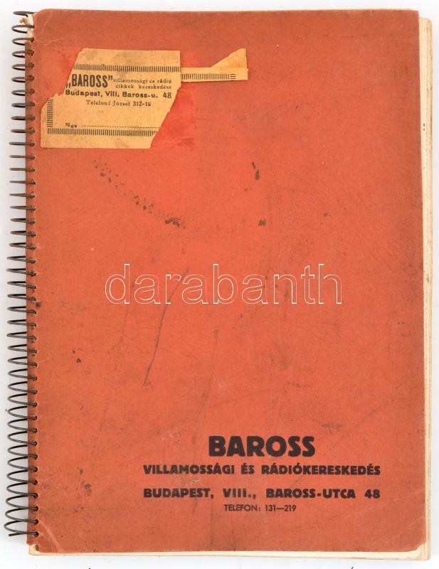 cca 1920-1930 "Baross villamossági és rádió kereskedés" árukatalógusa. Bp., én., Ifj. Kellner Ernő-ny., a címlap és az első két lap hiányzik. Spirálozott papírkötésben.