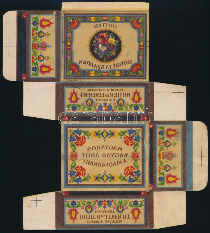 Leírás: cca 1920-1930 Hutter Bokréta szappan hajtatlan nyomdai karton, negatív nyomat, "Magyar árút a magyaroknak" felirattal, 22x18 cm
