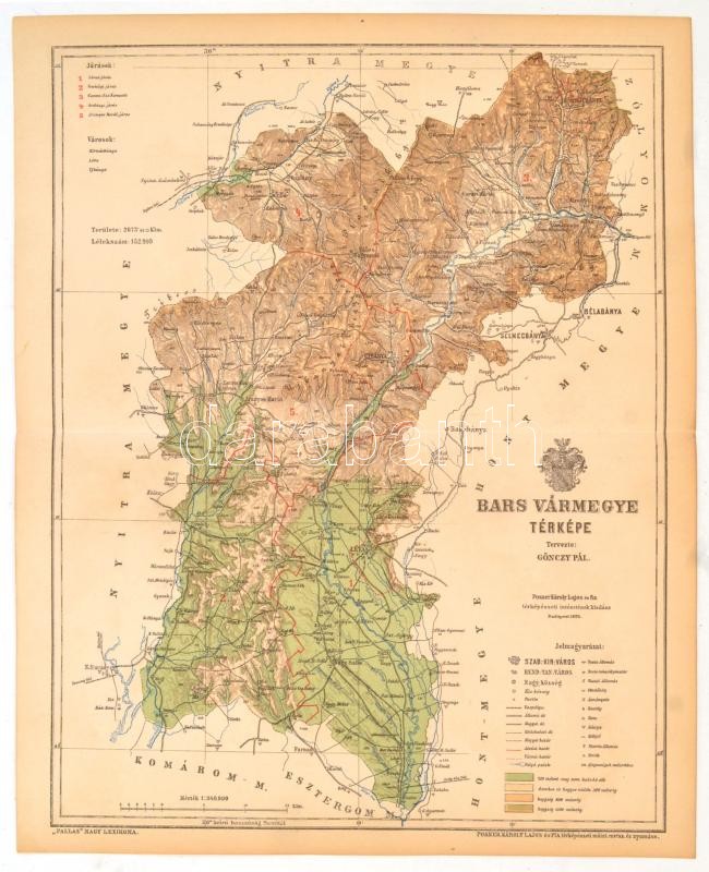 Leírás: 1893 Bars vármegye térképe,1:340.000, tervezte: Gönczy Pál, Pallas Nagy Lexikona, Bp., Posner, 29,5x24 cm
