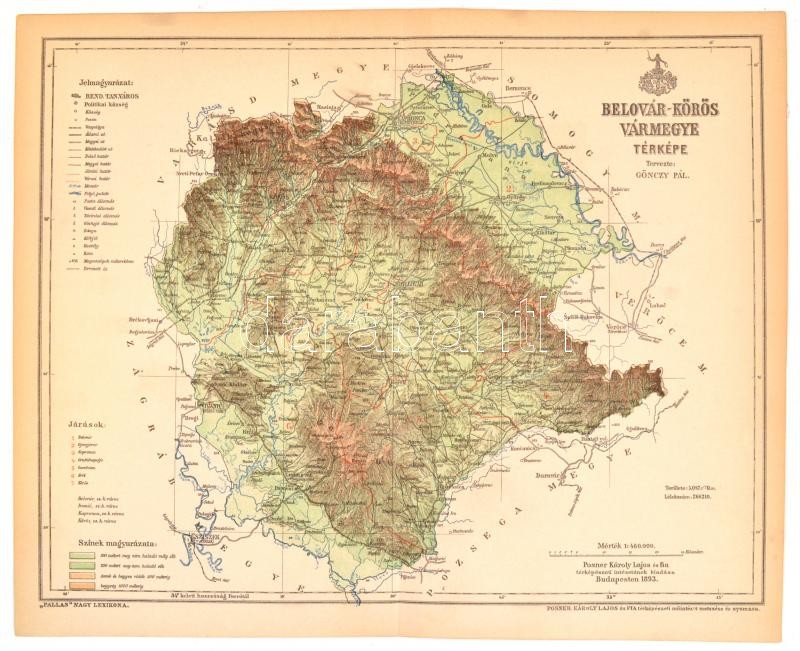 1893 Belovár-Körös vármegye térképe,1:460.000, tervezte: Gönczy Pál, Pallas Nagy Lexikona, Bp., Posner, lap hátulján kisebb javított szakadással, 24x30 cm