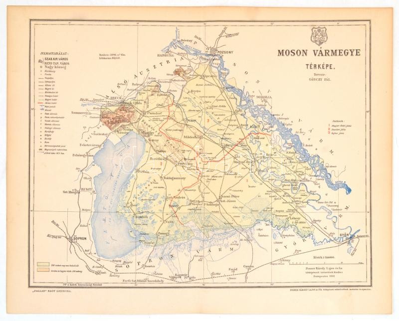 Leírás: 1896 Moson vármegye térképe,1:350.000, tervezte: Gönczy Pál, Pallas Nagy Lexikona, Bp., Posner, 24x30 cm