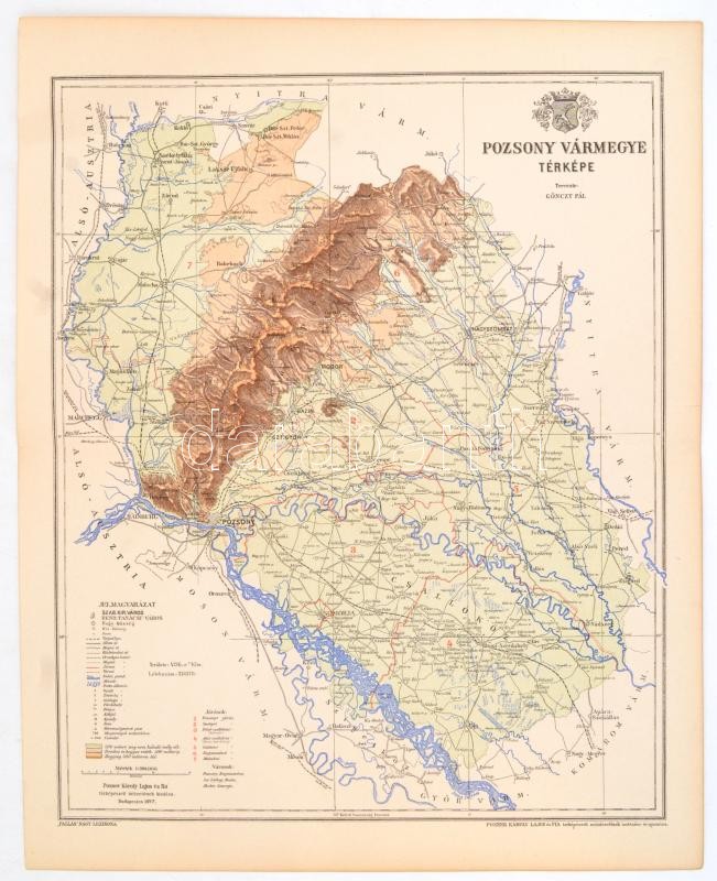 Leírás: 1897 Pozsony vármegye térképe, tervezte: Gönczy Pál, kiadja: Posner Károly Lajos és Fia, lap szélén kis sérüléssel, 30×24 cm