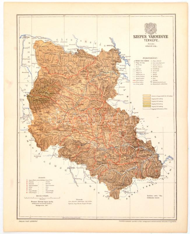 Leírás: 1897 Szepes vármegye térképe,1:420.000, tervezte: Gönczy Pál, Pallas Nagy Lexikona, Bp., Posner, 29,5x23,5 cm