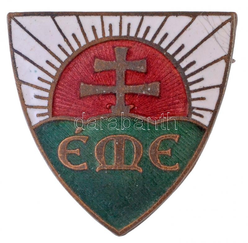 ~1920-1930. "ÉME (Ébredő Magyarok Egyesülete)" zománcozott Br jelvény az Egyesület 1924-es alapszabályaival és fegyelmi rendtartásával (24x24,5mm) T:2 kis zománchiba