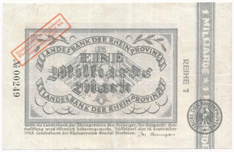 Németország / Weimari Köztársaság / Rheinprovinz / Düsseldorf 1923. 1.000.000.000M ("1924. április 1-ig érvényes a Rajna provincia egész területén" szövegű piros felülbélyegzéssel) T:III