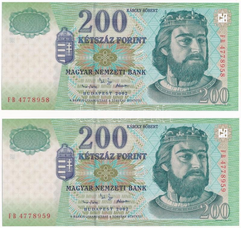 2002. 200Ft "FB" (2x) sorszámkövetők T:I https://www.darabanth.com/hu/373-Gyorsarveres/373.0/Numizmatika/Magyar-bankjegyek~2000007/2002-200Ft-FB-2x-sorszamkovetok-TI~II2182369