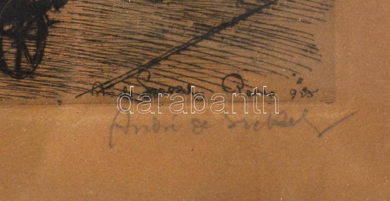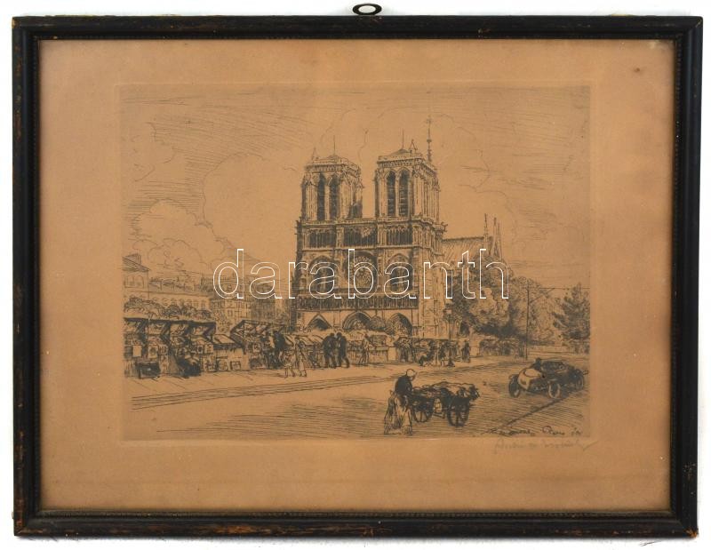 Leírás: André de S.... jelzéssel: Párizs, Notre Dame. Rézkarc, papír, datált a dúcon (915), üvegezett fa keretben, 24×29 cm