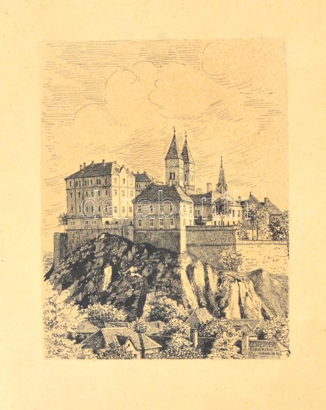 Leírás: Autheried Camilloné Hannibál Gizella (1881-1978): Veszprémi vár. Tus, papír, üvegezett keretben. 16,5x12 cm