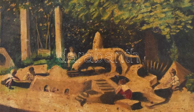 Leírás: Brósz Irma (1911-1976): Játszótér. Olaj, karton. Kissé sérült fa keretben, 26x38 cm