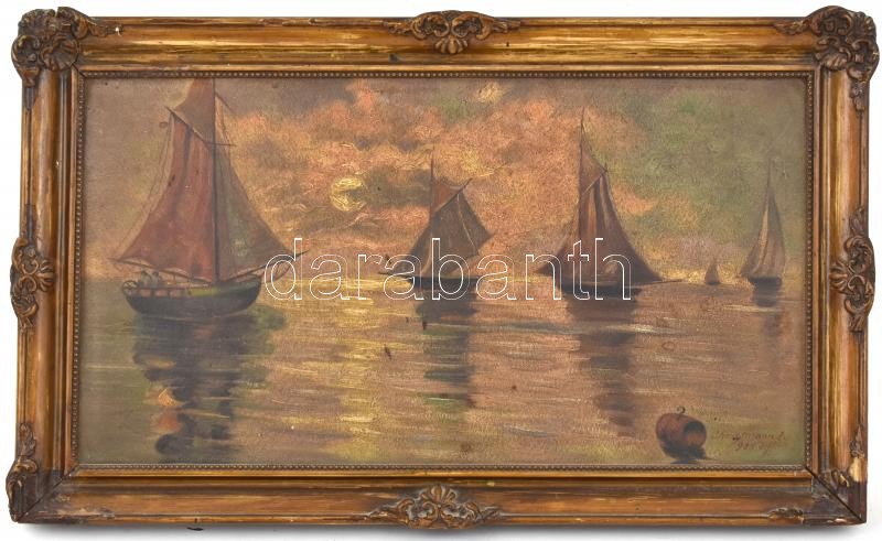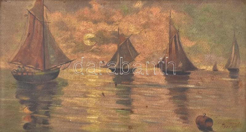 Leírás: Christmann J 929 jelzéssel: Vitorlások. Olaj, karton, sérült fa keretben, 22,5×40 cm