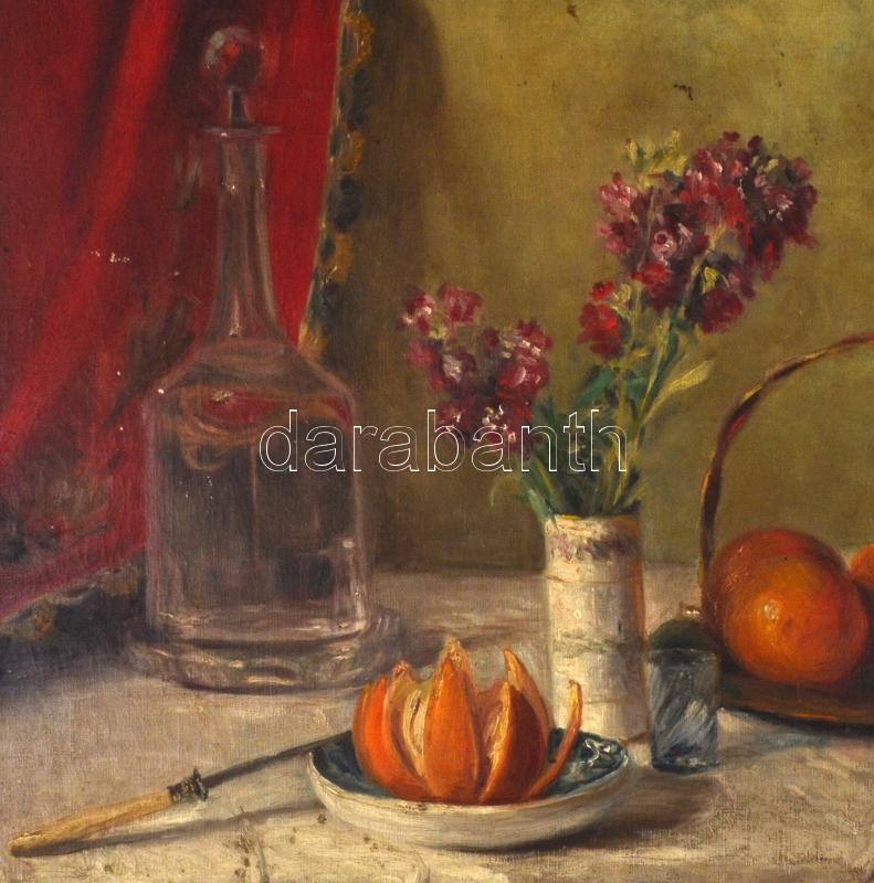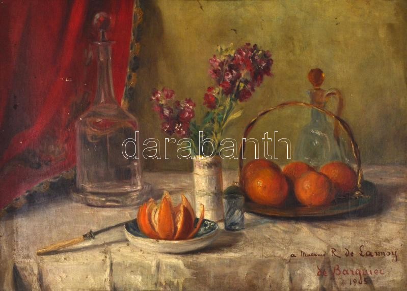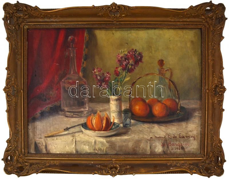 De Barquier 1905 jelzéssel, feltehetően francia festő alkotása: Csendélet virágokkal és narancsokkal. Olaj, vászon, ajándékozási sorokkal, neobarokk stílusú fa keretben, 50x73,5 cm / Signed De Barquier 1905, probably work of a french painter: Still life with flowers and oranges. Oil on canvas, framed, with dedication to madame R de Lannoy, 50x73,5 cm
