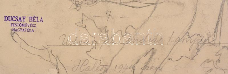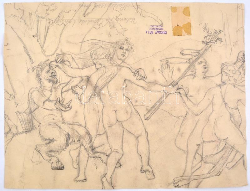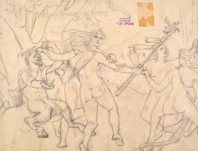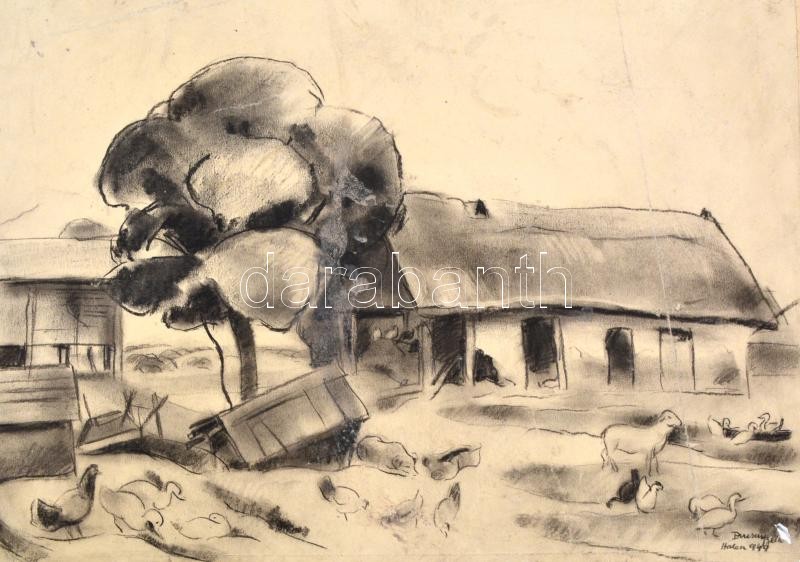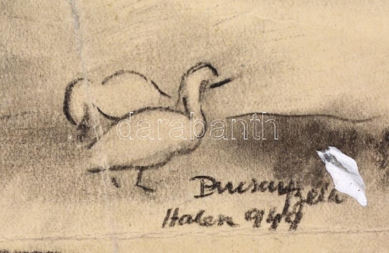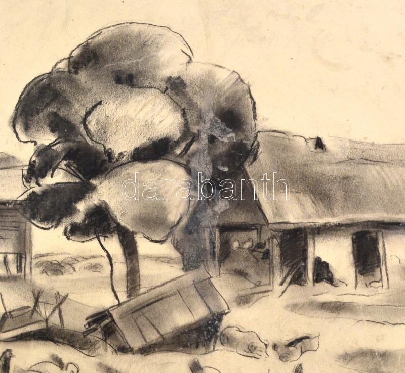 Ducsay Béla(1893-1967): Parasztudvar állatokkal. Szén, papír, papírra kasírozva jelzett, hátoldalán hagyatéki bélyegzővel és egy másik rajzzal (Faun és nimfák), sérült, foltos 24,5x34,5 cm