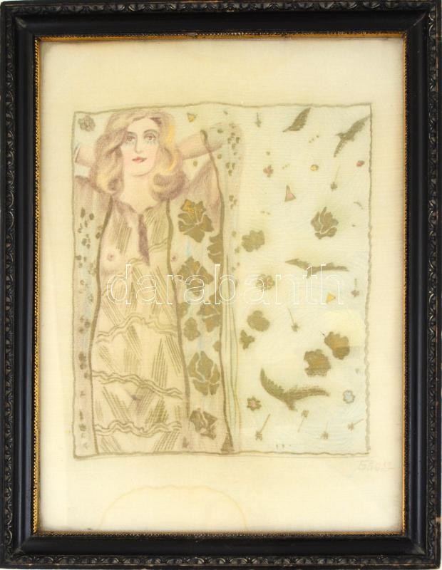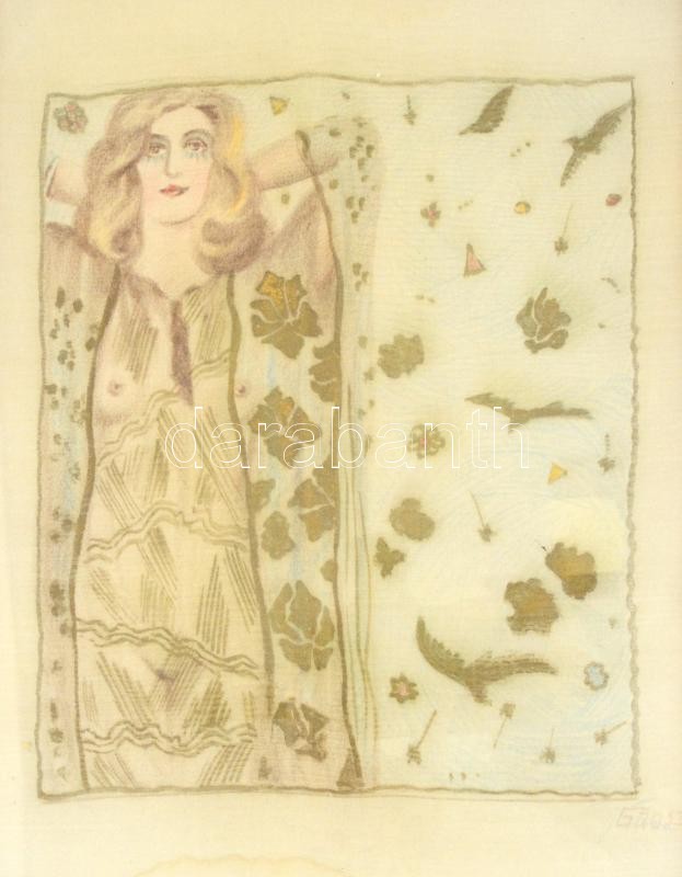 Leírás: Grosz jelzéssel: Lengén öltözött hölgy (erotikus grafika). Vegyes technika, selyem, tetején és alján kissé foltos, üvegezett fa keretben, 31x22,5 cm