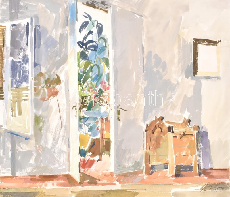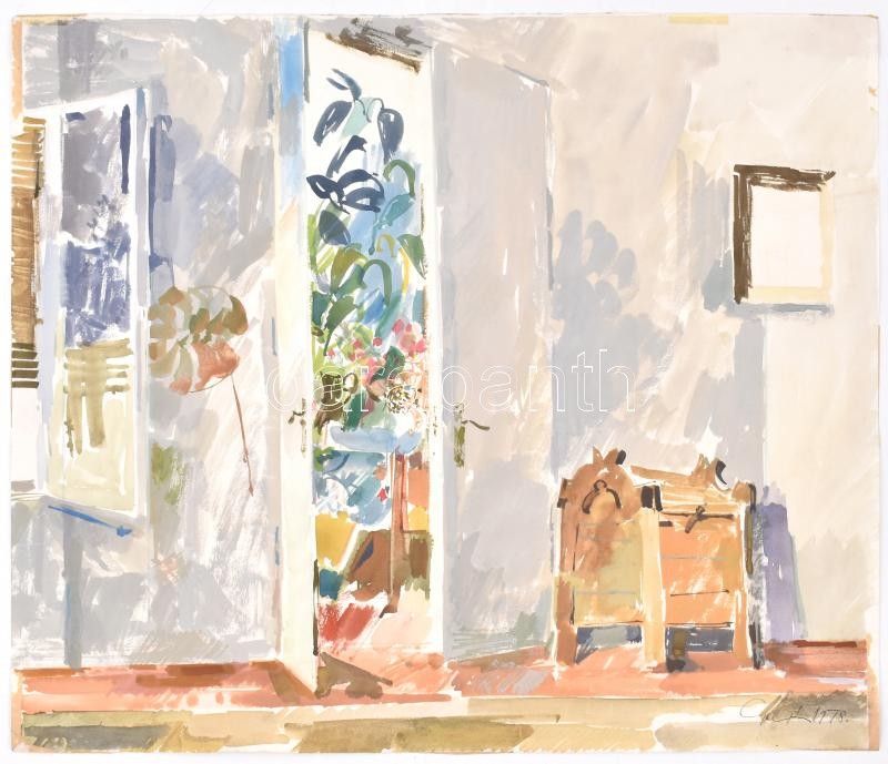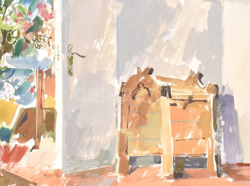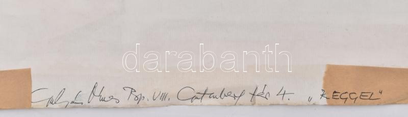 Gulyás Dénes (1927-2003): Reggel (Gutenberg tér). Akvarell, papír, jelzett és datált (Gulyás 1978), lap hátoldalán autográf felirattal és szélein ragasztás nyomaival, 42x51 cm