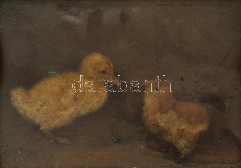 Jelzés nélkül, 1910-25 körül: A vetélytársak (kiscsibék). Olaj, fa, sé... https://www.darabanth.com/hu/374-Gyorsarveres/374.0/Festmenyek-es-grafikak/Festmenyek-es-grafikak~1/Jelzes-nelkul-1910-25-korul-A-vetelytarsak-kiscsibek-Olaj-fa-serult-hatoldalan-c~II2191415