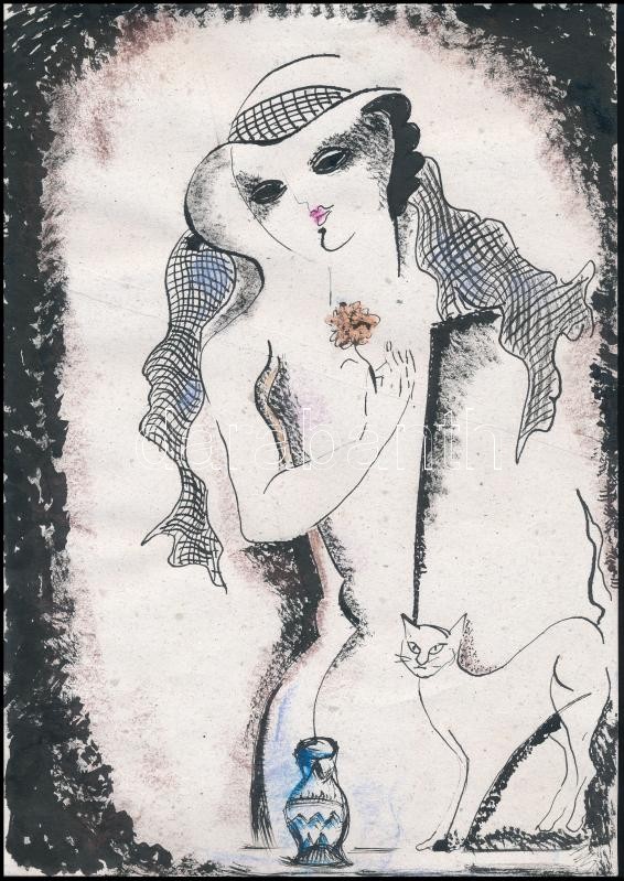 Leírás: Jelzés nélkül: Macskás lány. Vegyes technika, papír. 30x20 cm