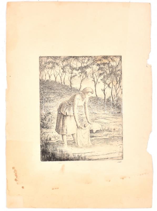 Leírás: Jelzés nélkül: Mosás a patakparton. Rézkarc, papír, lap sérült és hiányos, rézkarc ép, 22x17 cm