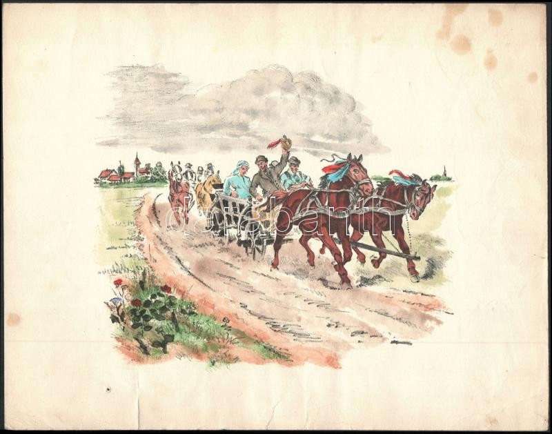 Jelzés nélkül: Száguldó lovasszekerek. Akvarellel színezett litográfia, papír. Hátoldalán "Hadirokkant Képterjesztő, Budapest, VI., Andrássy út 97." bélyegzővel. Lap széle foltos, lap bal alsó sarkában kis lyukkal, ábrázolás ép, ca. 21x24,5 cm