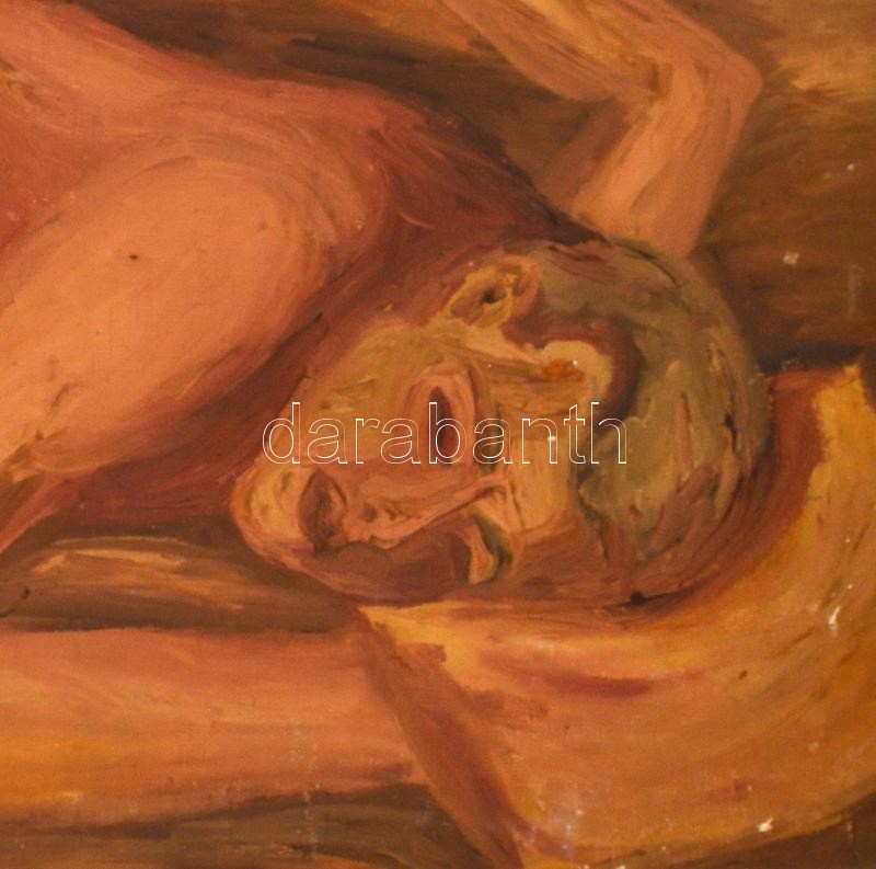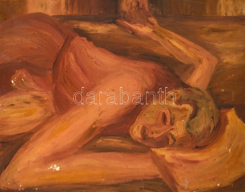 Jelzés nélkül, feltehetően észak-amerikai festő műve: Fekvő expresszív alak. Olaj, vászon, sérült. Hátoldalán Anco Bilt, Glendale, N. Y. (New York állam) bélyegzővel. 61x48 cm / Unsigned, probably work of a North-american painter. Expressive lying human. Oil on canvas, damaged. With Anco Bilt, Glendale, N. Y. stamp on the back. 61x48 cm