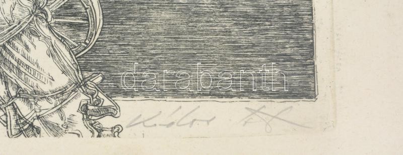 Leírás: Kádas István (1941-): Gellért püspök. Rézkarc, papír, jelzett, számozott (40/100), üvegezett keretben, 30×48 cm