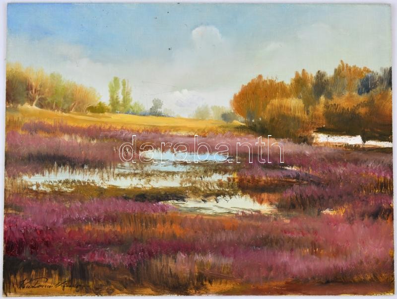 Leírás: Katona jelzéssel: Táj. Olaj, farost, felületén kisebb karcolásokkal, 30x40 cm
