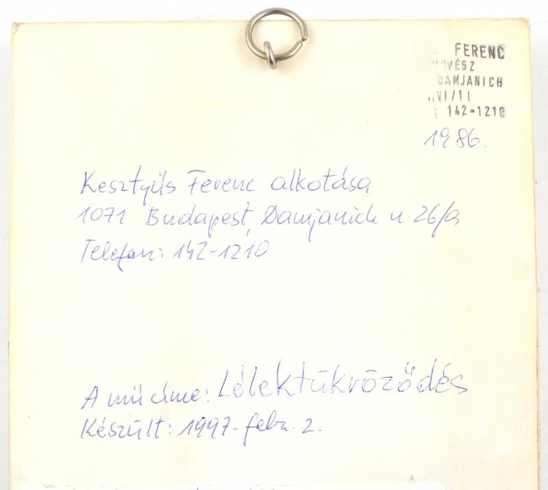 Kesztyűs Ferenc (1932-): Lélektükröződés, 1997. Tűzzománc, jelzett, h... https://www.darabanth.com/hu/374-Gyorsarveres/374.0/Festmenyek-es-grafikak/Festmenyek-es-grafikak~1/Kesztyus-Ferenc-1932-Lelektukrozodes-1997-Tuzzomanc-jelzett-hatoldalan-a-muvesz~II2184306