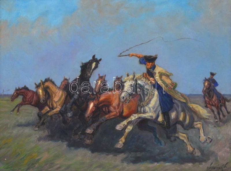 Leírás: Kolozsváry Kamilló (1936-2008): Csíkós vágtázó lovakkal. Olaj, vászon, kis felületi sérüléssel, jelzett, díszes fa keretben, 60×80 cm