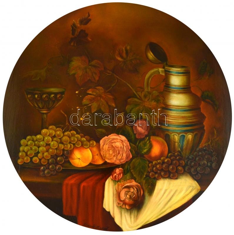 Leírás: Kránitz Margit (1928-2000): Csendélet. Olaj, farost, jelzett, fa keretben, d: 58 cm