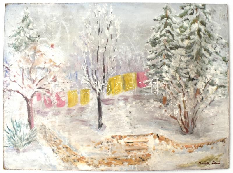Leírás: Márffy jelzéssel: Téli táj. Olaj, farost, 58,5x80 cm