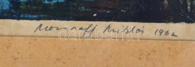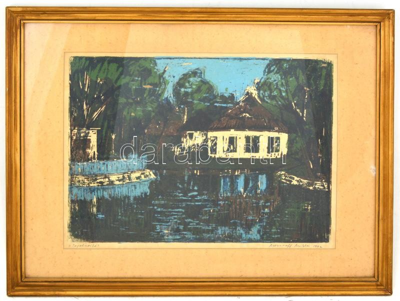 Leírás: Mazsaroff Miklós (1929-1997): Tapolcai tó: Színes linómetszet, papír, jelzett és datátlt, üvegezett fa keretben, 35x46 cm
