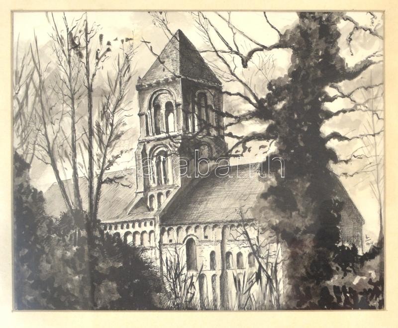 Leírás: Olvashatatlan (L 74?) jelzéssel: Templom. Tus, papír, üvegezett fa keretben, 18,5x23 cm