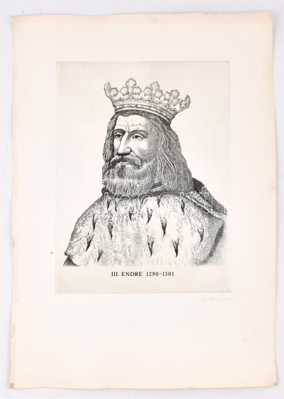 Leírás: Olvashatatlan jelzéssel: III. Endre magyar király, rézkarc, papír, jelzett, lap széle sérült, rézkarc ép, 38×28 cm