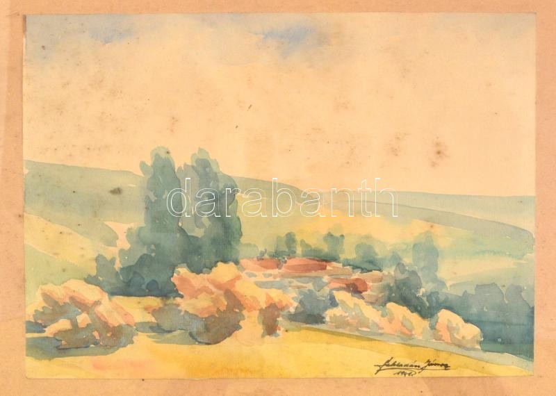 Leírás: Olvashatatlan jelzéssel (... János 1941): Zöldellő táj. Akvarell, papír, kartonra kasírozva. Üvegezett, kopott fa keretben, 20,5x29 cm