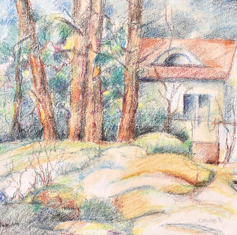Leírás: Orbán D. jelzéssel: Ház a fák mögött. Kréta, karton. Fa keretben, 38x38 cm