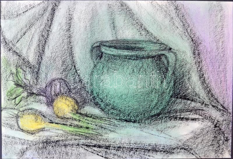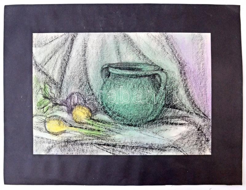 Leírás: Sebestyén Ágnes (?-): Hagymás csendélet, vegyes technika, papír, paszpartuban, jelzett, hátoldalán címkén feliratozott, 32,5x47,5 cm